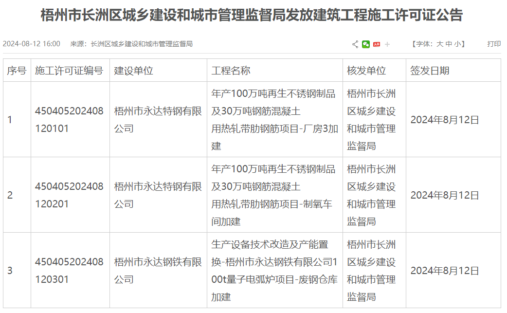 8月12日,梧州市永達特鋼有限公司年產100萬噸再生不銹鋼制品及30萬噸鋼筋混凝土用熱軋帶肋鋼筋項目廠房3加建、制氧車間加建以及100t量子電弧爐項目廢鋼倉庫加建均獲建筑工程施工許可證。