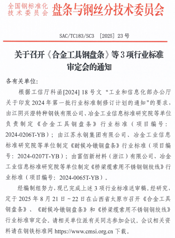 2025年8月4日,由由富佰新材料(浙江)有限公司、冶金工業(yè)信息標準研究院等單位制定《橋梁纜索用不銹鋼鋼絞線》等3項行業(yè)標準已完成標準送審稿,將于2025年8月21日-22日在山西省太原市召開業(yè)標準審定會。